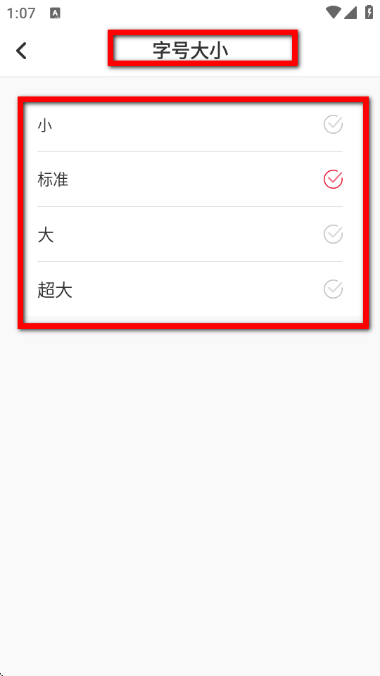 4、在頁(yè)面中選擇小、標(biāo)準(zhǔn)、大或超大字號(hào),完成字體大小設(shè)置操作。