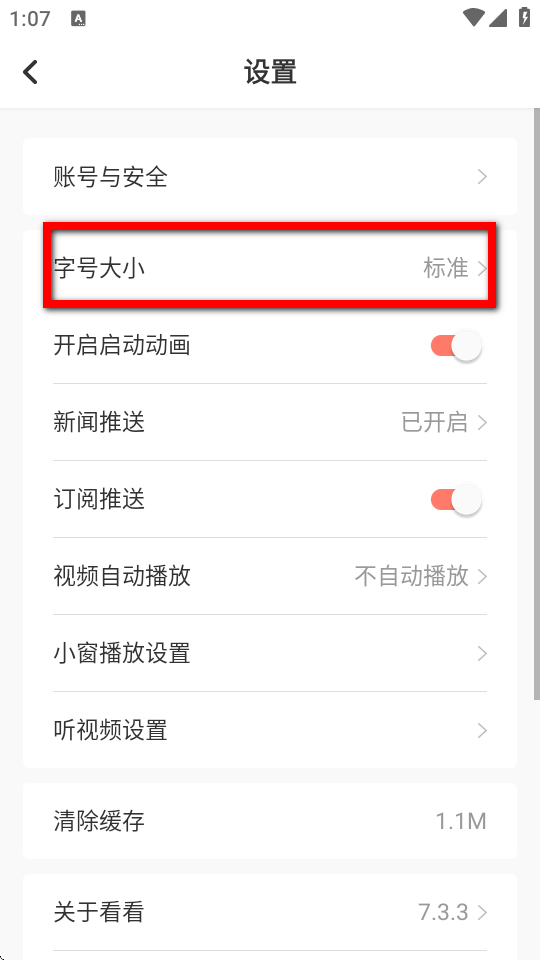 3、在設(shè)置頁(yè)面,點(diǎn)擊字號(hào)大小選項(xiàng),進(jìn)入字號(hào)大小選擇頁(yè)面。