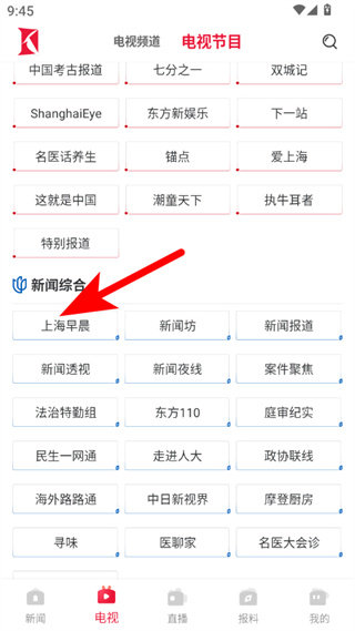 3、在節(jié)目列表頁(yè)面,選擇新聞綜合類的上海早晨等節(jié)目,進(jìn)入節(jié)目播放頁(yè)面。