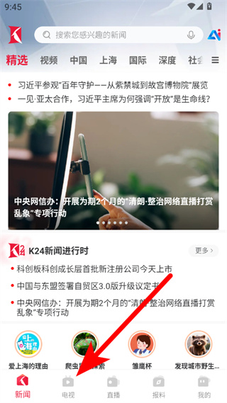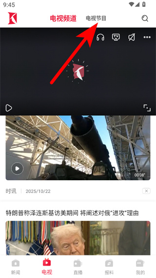 1、在看看新聞app首頁(yè),點(diǎn)擊電視選項(xiàng),進(jìn)入電視頻道頁(yè)面。