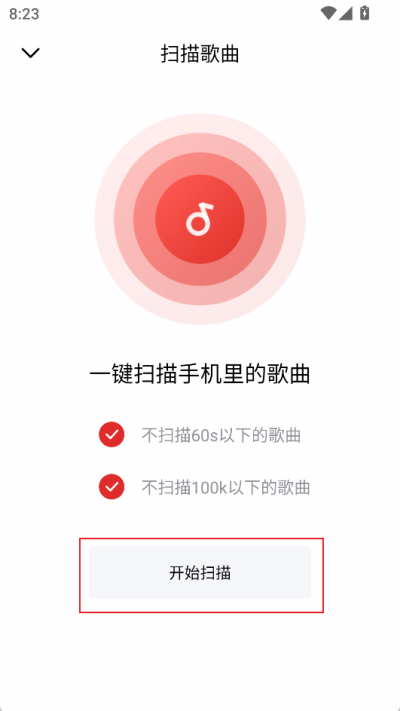 4、點擊后進入掃描歌曲界面,在這里可以一鍵掃描手機里的歌曲,點擊下方的【開始掃描】,最后將掃描出來的歌曲導入進來即可。