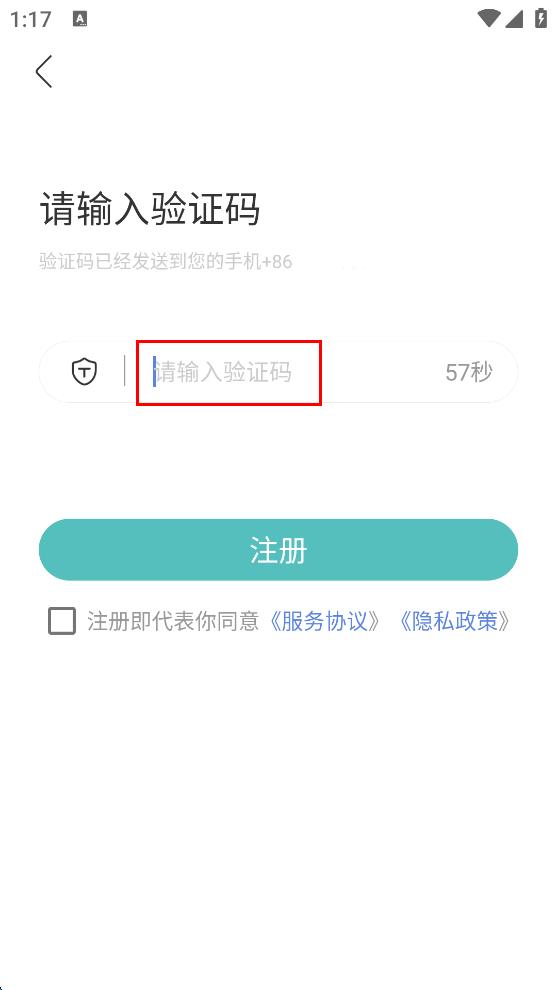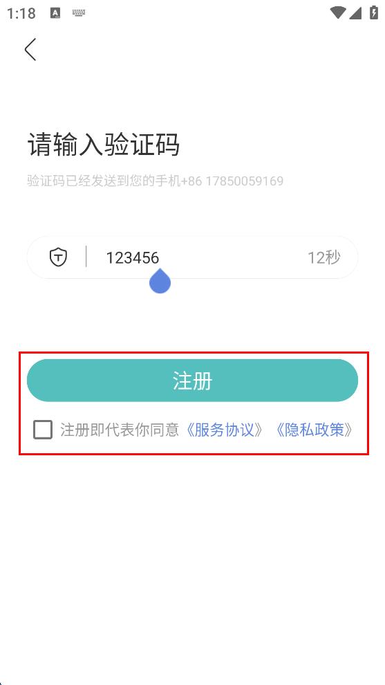 4、輸入好驗證碼后,勾選注冊即代表你同意服務(wù)協(xié)議,隱私政策,最后點擊注冊按鈕,完成注冊流程。