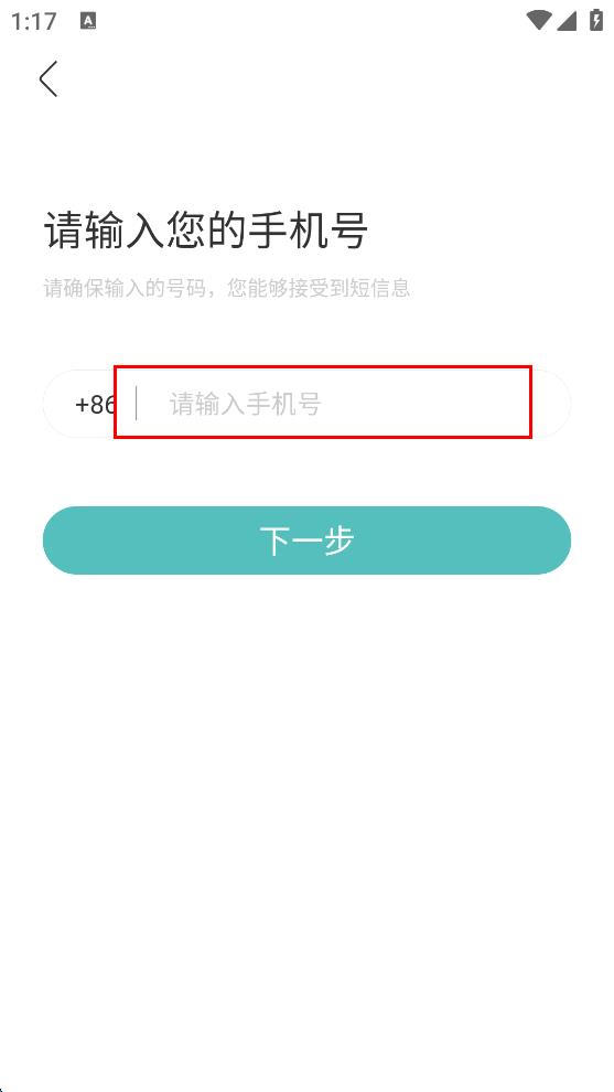 2、在手機號填寫頁面,輸入自己的手機號,然后點擊下一步,進入驗證碼填寫頁面。