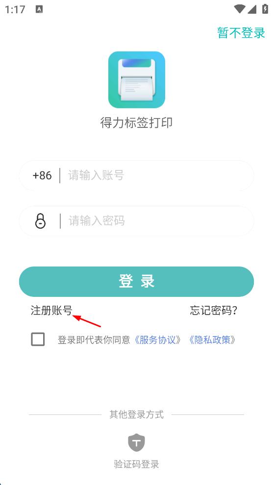 1、打開得力標簽打印軟件,進入登錄頁面,點擊注冊賬號,進入注冊流程的手機號填寫頁面。