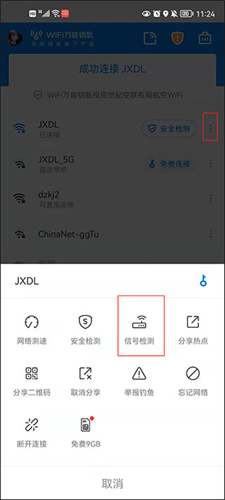 2、接著我們在正在使用的WIFI熱點(diǎn)的名稱右側(cè),找到三個(gè)點(diǎn)的圖標(biāo)并點(diǎn)擊,如下圖所示,點(diǎn)擊后屏幕下方就會(huì)彈出一個(gè)頁面,我們找到【信號檢測】并點(diǎn)擊;