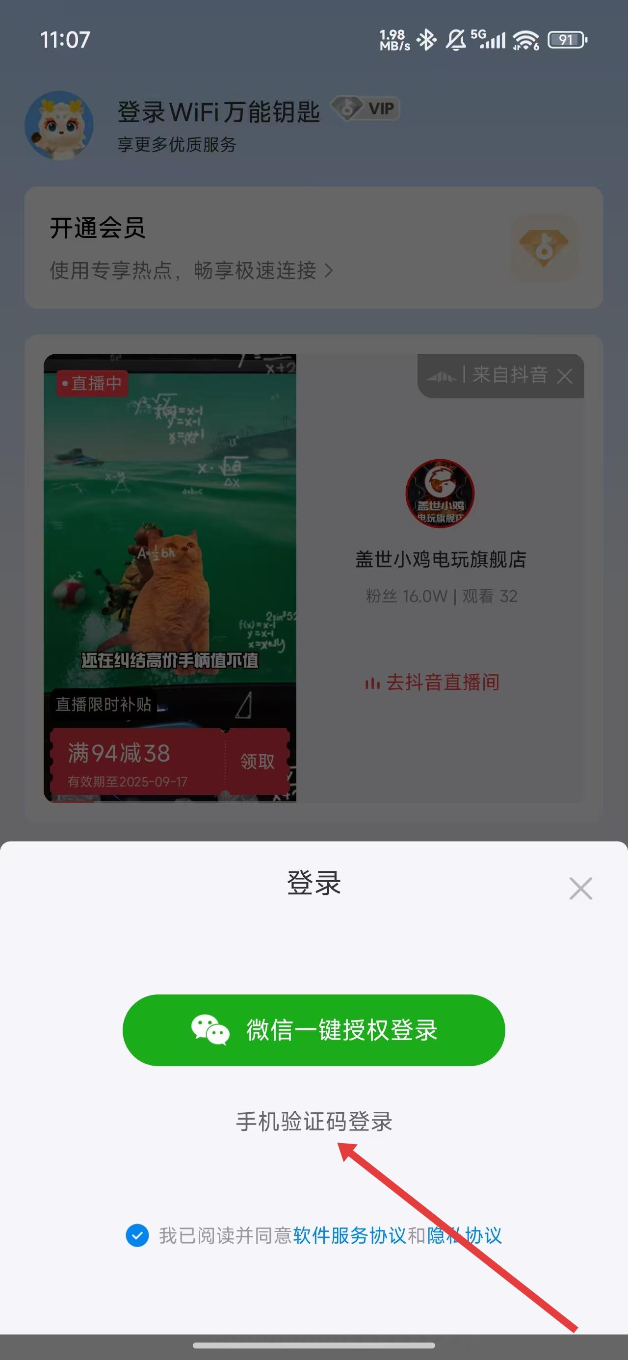 1、在進(jìn)入到登錄頁面中,點(diǎn)擊下方手機(jī)驗(yàn)證碼登錄按鈕,使用該方式登錄。