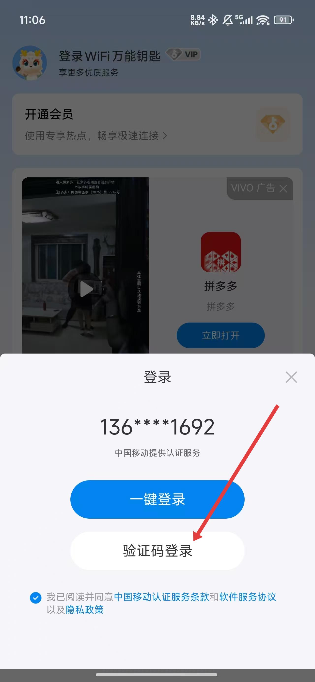 2、通過點(diǎn)擊驗(yàn)證碼登錄按鈕,開始準(zhǔn)備使用短信驗(yàn)證碼登錄賬號。
