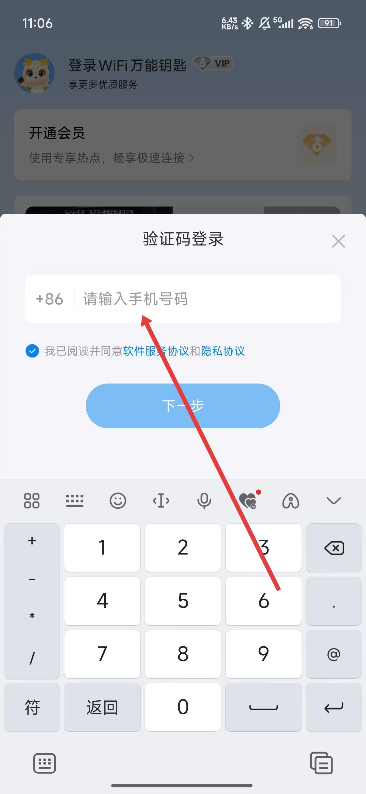 3、在驗(yàn)證碼登錄界面中,點(diǎn)擊輸入框填寫手機(jī)號以便獲取驗(yàn)證碼登錄。