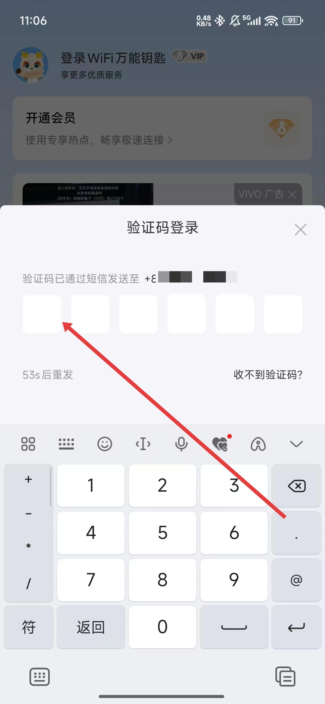 4、在填寫完手機(jī)號后等待驗(yàn)證碼,點(diǎn)擊方框填寫后完成登錄操作。
