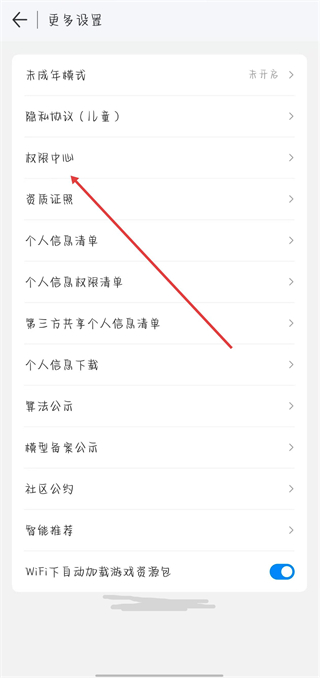3、在更多設(shè)置頁面,點(diǎn)擊權(quán)限中心選項(xiàng)。