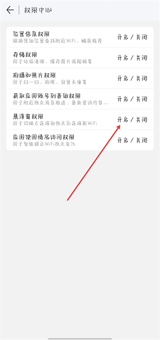 4、找到懸浮窗權(quán)限,點(diǎn)擊其右側(cè)的開啟按鈕。