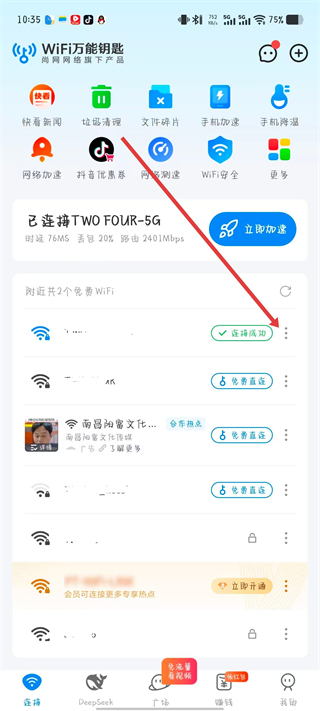 1、打開WiFi萬能鑰匙APP,在WiFi右側(cè)點(diǎn)擊三點(diǎn)按鈕。