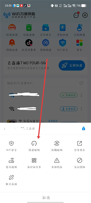 2、在彈出的菜單中,找到并點(diǎn)擊網(wǎng)速檢測選項(xiàng)。