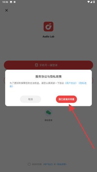 4、點(diǎn)擊后,會(huì)彈出服務(wù)協(xié)議與隱私政策的提示,點(diǎn)擊我已閱讀并同意的按鈕即可開(kāi)始登錄。