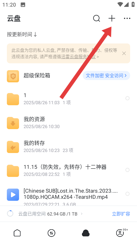 1、打開(kāi)迅雷APP,進(jìn)入云盤(pán)的頁(yè)面,需要點(diǎn)擊右上角+的圖標(biāo),會(huì)彈出功能的菜單。