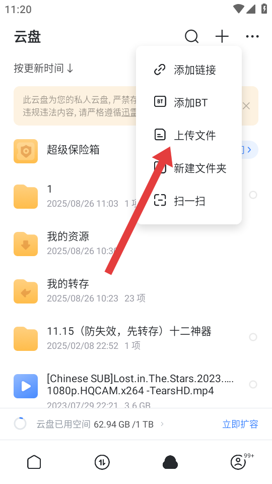 2、然后在功能的菜單中,需要點(diǎn)擊上傳文件的選項(xiàng),進(jìn)入手機(jī)文件的選擇界面。