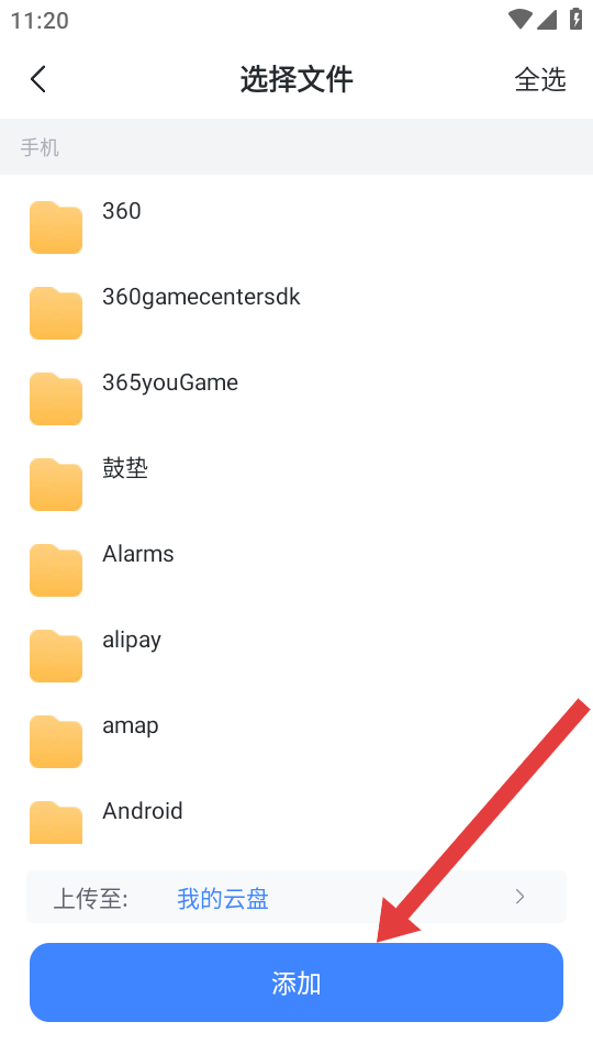 3、在選擇文件的頁(yè)面中,找到并選中要上傳的文件夾,點(diǎn)擊底部添加按鈕,即可將文件夾上傳至迅雷云盤(pán)。