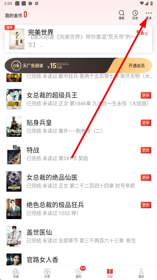 1、打開(kāi)追書(shū)神器,進(jìn)入書(shū)架頁(yè)面,點(diǎn)擊右上角更多按鈕。