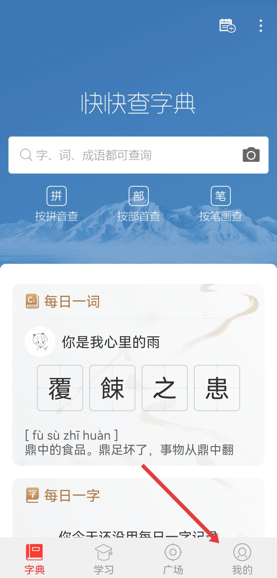 1、打開快快查字典APP,點(diǎn)擊右下角我的,進(jìn)入個(gè)人的頁面。