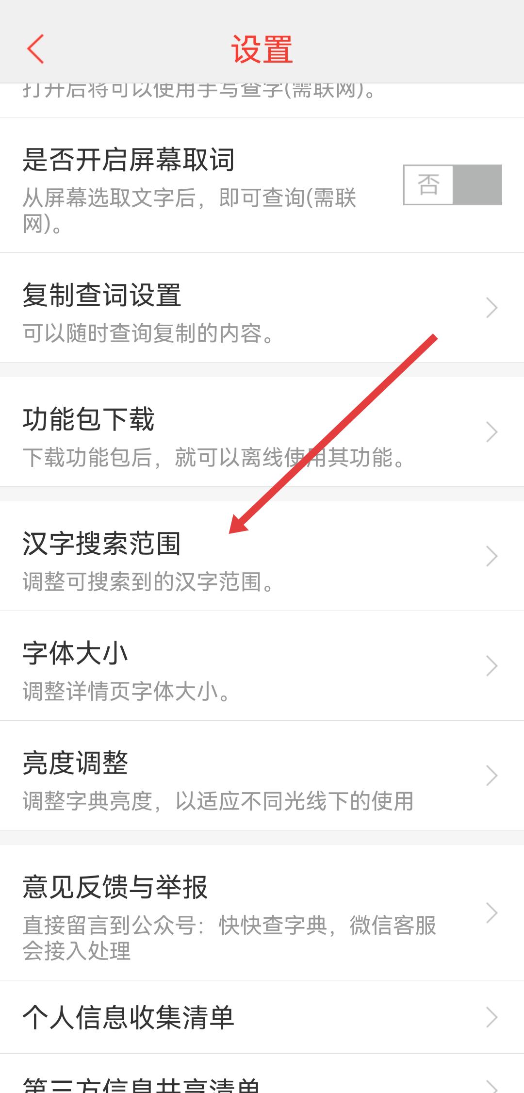 3、在設(shè)置界面里,點(diǎn)擊漢字搜索范圍選項(xiàng),彈出搜索范圍設(shè)置窗口。