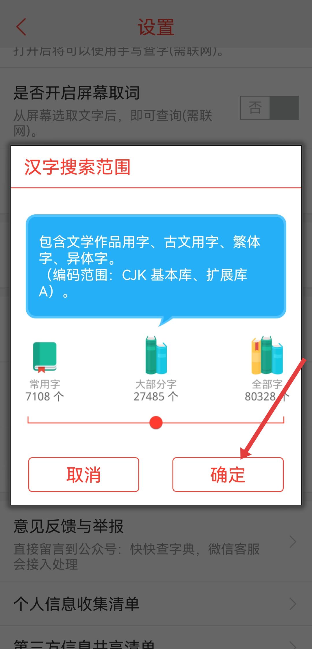 4、在漢字搜索范圍窗口中,調(diào)整好需要的漢字搜索范圍后,點(diǎn)擊確定按鈕。