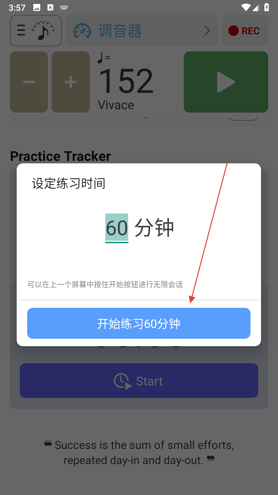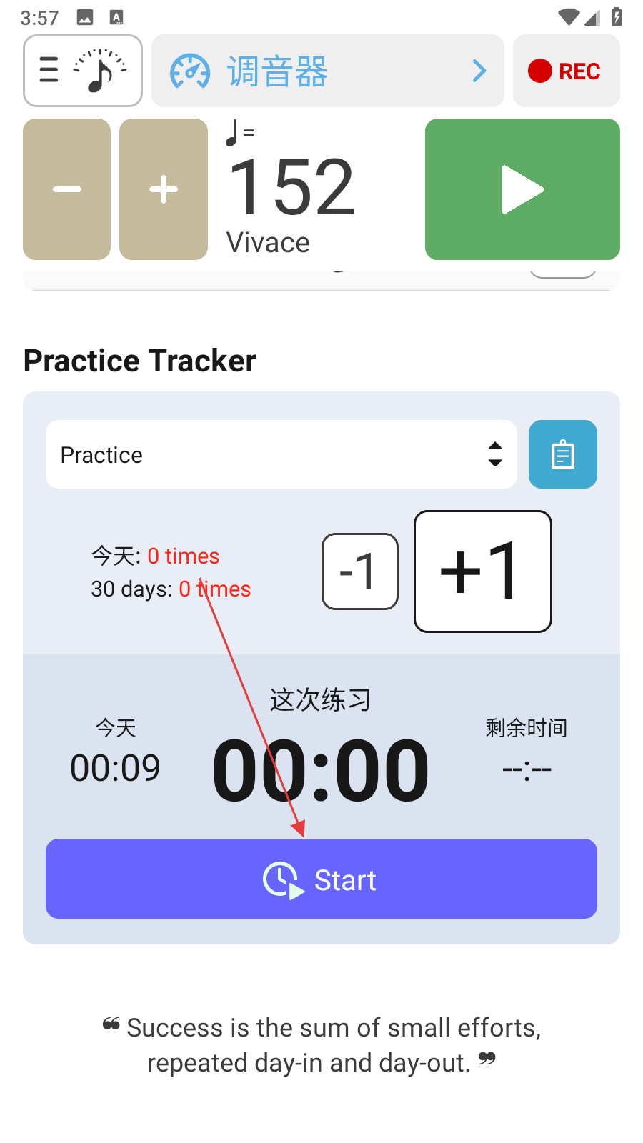 1、打開調(diào)音器和節(jié)拍器軟件找到Practice Tracker區(qū)域,點擊下方Start按鈕準備進行練習(xí)計時。