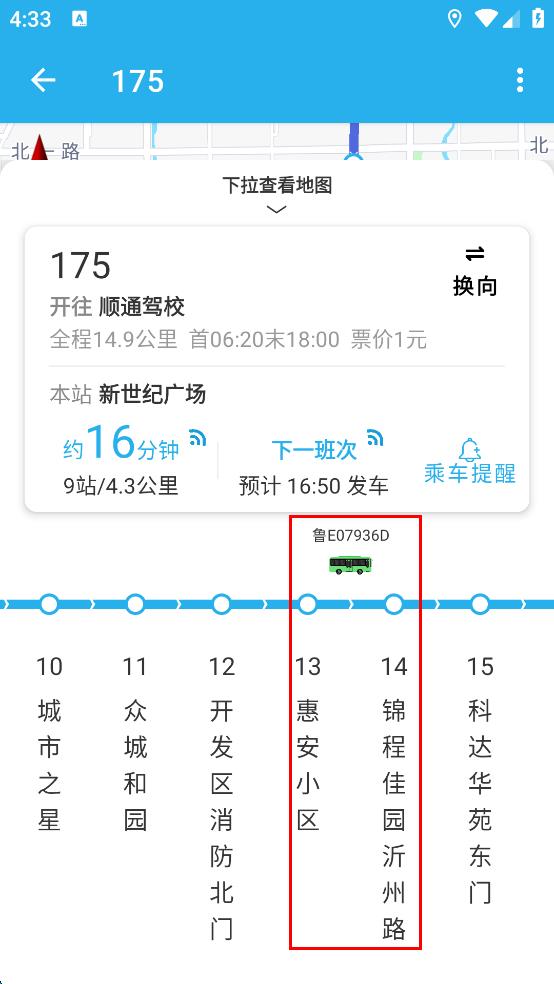 4、在175路線路詳情頁面,可查看該線路的全程距離、首末班車時間、票價等信息,以及車輛實時位置、站點等內(nèi)容,方便規(guī)劃公交出行。