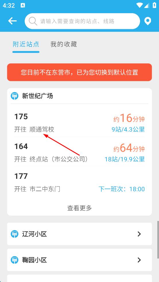 3、在公交實時查詢頁面,可看到附近站點及對應的公交信息,選擇想要查詢的公交線路,比如175路,點擊進入該線路詳情頁面。