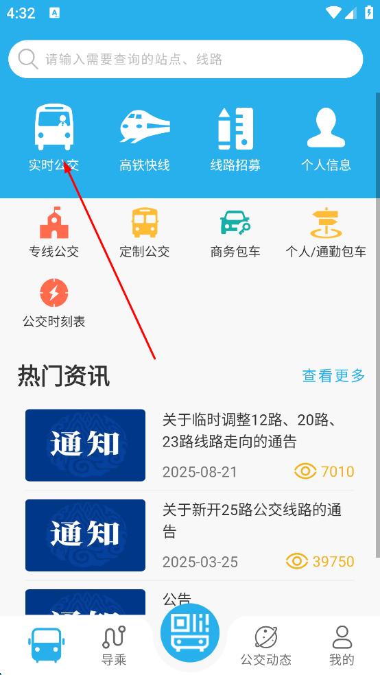2、在主界面,點擊“實時公交”選項,進入公交實時查詢頁面,準備查看公交實時信息。