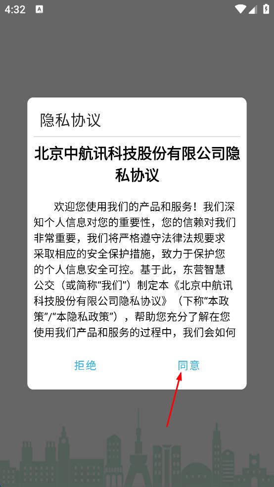 1、打開東營智慧公交APP,彈出隱私協(xié)議提示框,仔細閱讀后點擊“同意”按鈕,進入APP主界面。