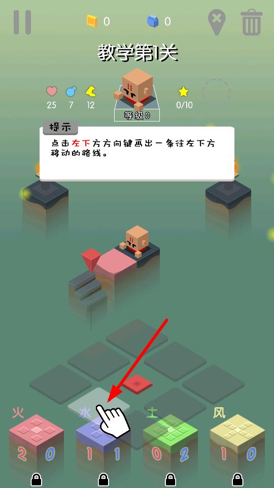 1、在教學第1關根據(jù)提示點擊左下方方向鍵,按要求畫出一條往左下方移動的路線,熟悉基礎移動操作,開啟游戲之旅。