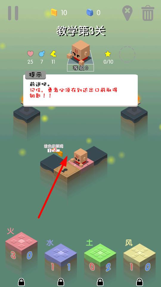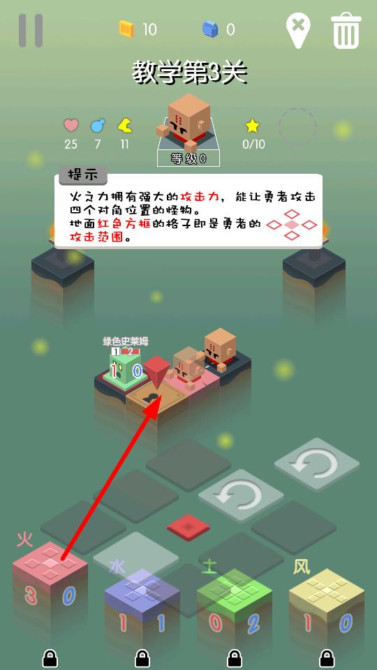 2、了解火之力的特性,其擁有強大攻擊力,可讓勇者攻擊四個對角位置的怪物,合理利用火之力應對綠色史萊姆等怪物。