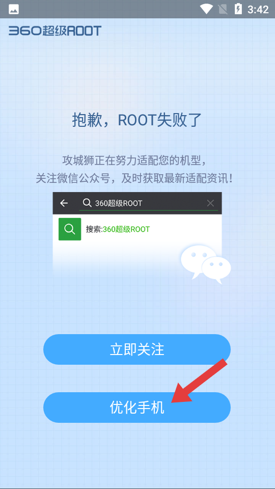 3、若ROOT失敗,點(diǎn)擊優(yōu)化手機(jī)的按鈕,進(jìn)入手機(jī)優(yōu)化的界面。