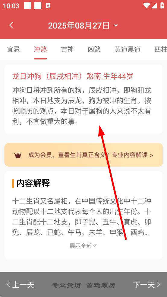 3、若想了解詳細(xì)解釋,點(diǎn)擊相關(guān)沖煞信息區(qū)域,進(jìn)入詳情頁(yè)面,查看關(guān)于今日屬什么沖什么的具體解讀。