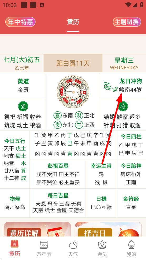 2、在黃歷主界面中,查看當(dāng)天信息,找到顯示龍日沖狗煞南44歲等字樣的區(qū)域,這就是當(dāng)天屬相沖煞信息。