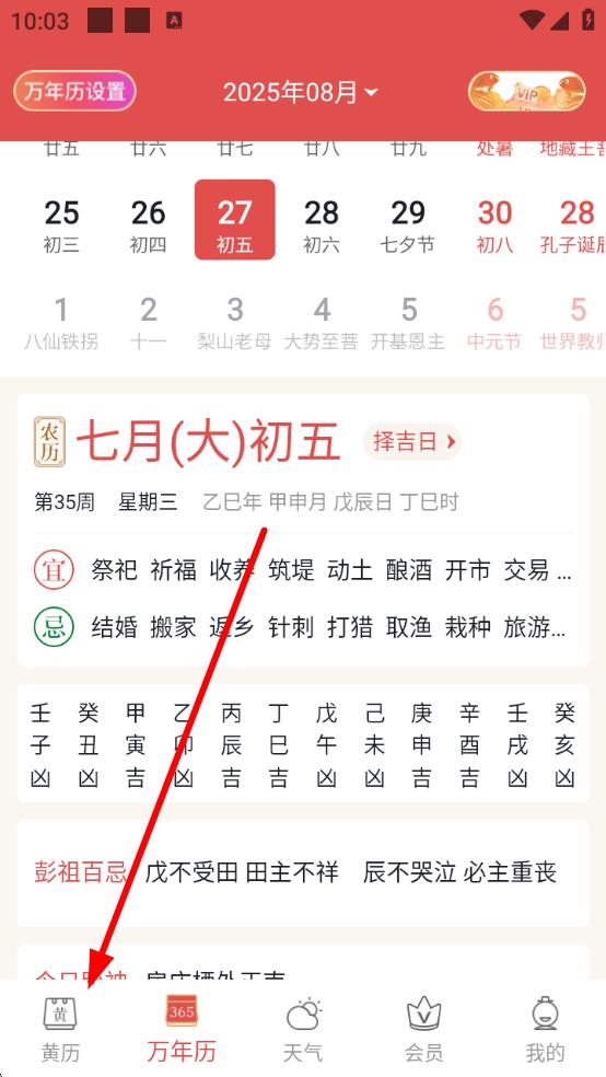 1、打開老黃歷APP,點(diǎn)擊底部導(dǎo)航欄最左側(cè)的黃歷選項(xiàng),進(jìn)入黃歷主界面。