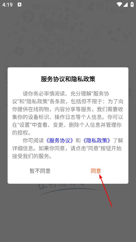 1、打開奇龍商家APP,彈出服務(wù)協(xié)議和隱私政策窗口,閱讀后點擊“同意”按鈕,進入登錄界面。