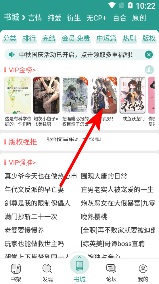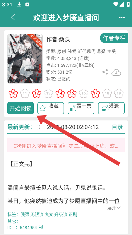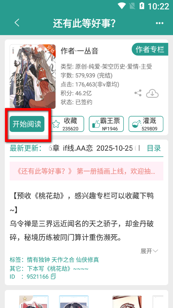 1、在晉江小說閱讀書城頁面,點擊想要閱讀的小說封面,進入小說詳情頁面。