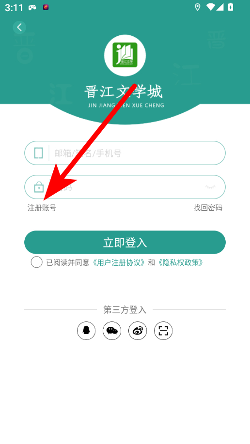 2、在個人頁面,點擊注冊按鈕,進入晉江文學(xué)城登錄注冊界面。