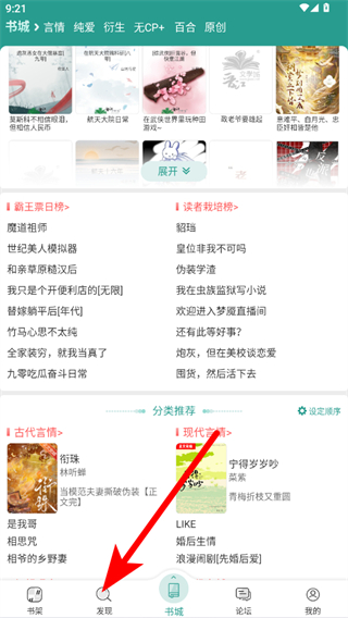 1、在晉江小說閱讀書城頁面,點擊下方發(fā)現(xiàn)選項,進入搜索界面。