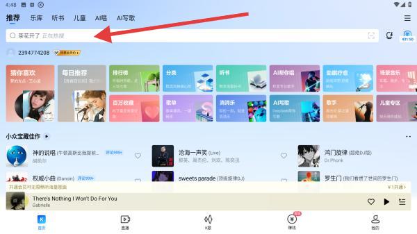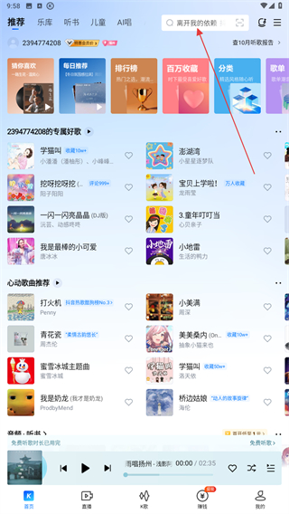 1、打開酷狗音樂APP,點(diǎn)擊首頁頂部搜索欄,激活輸入框。