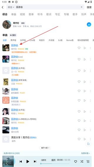 3、當(dāng)搜索結(jié)果出來后,找到目標(biāo)歌曲點(diǎn)擊即可。