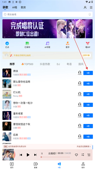 2、進(jìn)入錄歌的頁面內(nèi),在推薦下選擇并點(diǎn)擊要k歌的歌曲。