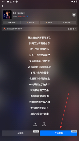 3、進(jìn)入預(yù)備錄歌的頁面內(nèi),點(diǎn)擊右下方開始演唱的按鈕即可。