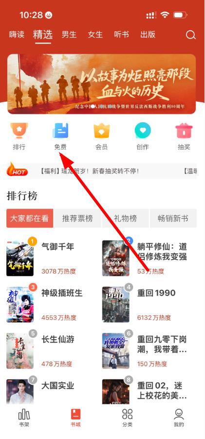 1、進(jìn)入首頁(yè),點(diǎn)擊下方導(dǎo)航欄中的書城,然后在書城界面上方找到并點(diǎn)擊免費(fèi)選項(xiàng)。