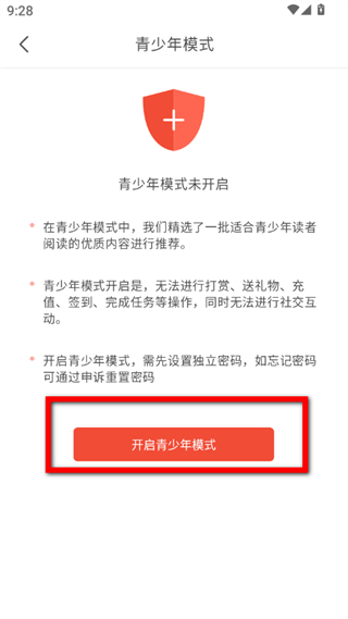 4、在青少年模式界面,點(diǎn)擊開啟青少年模式按鈕,即可進(jìn)行模式開啟操作。
