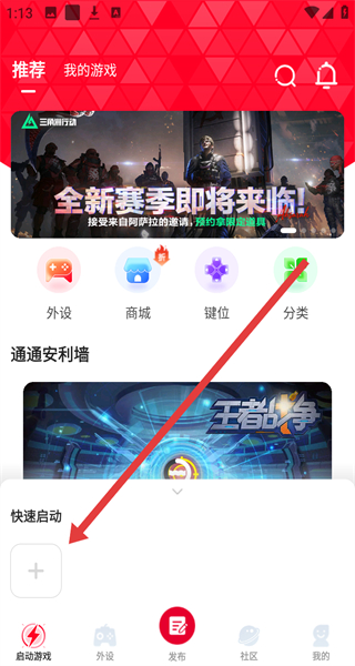 1、在游戲平臺(tái)首頁點(diǎn)擊“快速啟動(dòng)”區(qū)域的加號(hào),進(jìn)入添加本地游戲頁面。