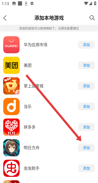 2、添加本地游戲頁面找到“明日方舟”,點(diǎn)擊右側(cè)“添加”。