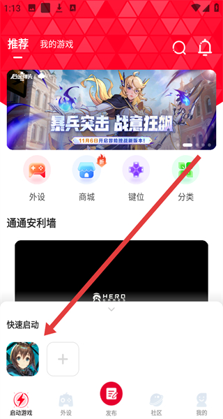 3、添加完成后返回首頁,“快速啟動(dòng)”區(qū)域顯示“明日方舟”游戲圖標(biāo)。