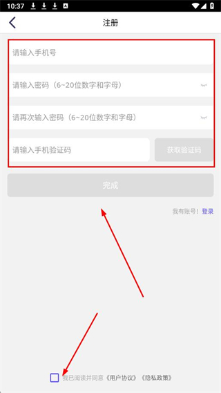 2、在注冊(cè)頁(yè)面,輸入注冊(cè)所需信息,勾選協(xié)議,點(diǎn)擊完成。
